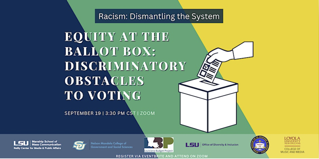 Southern Univesity joins partners for the first installment of season seven of the “Racism: Dismantling the System” series. The new episode, “Equity at the Ballot Box: Discriminatory Obstacles to Voting,” will take place Sept. 19, 2023, at 3:30 p.m. CT, via Zoom. The Reilly Center for Media & Public Affairs at LSU’s Manship School of Mass Communication is host for this public event.