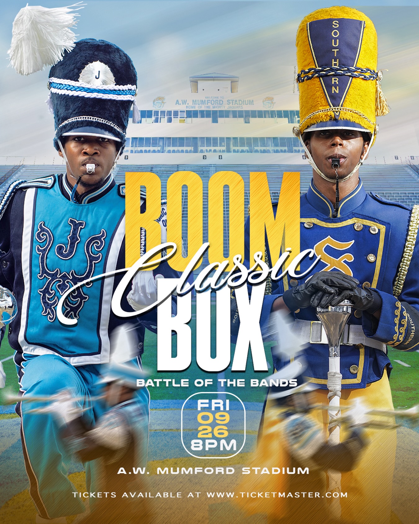 The Southern University Human Jukebox Marching Band will meet the Jackson State University Sonic Boom of the South for the Boombox Classic Battle of the Bands at 8 p.m. Friday, Sept. 26, at A.W. Mumford Stadium.