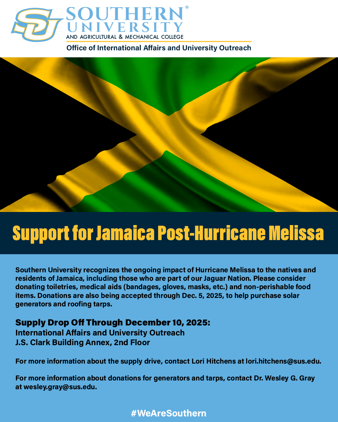 The Southern University Office of International Affairs and University Outreach has launched a campus-wide recovery initiative to support families and communities in Jamaica affected by Hurricane Melissa.