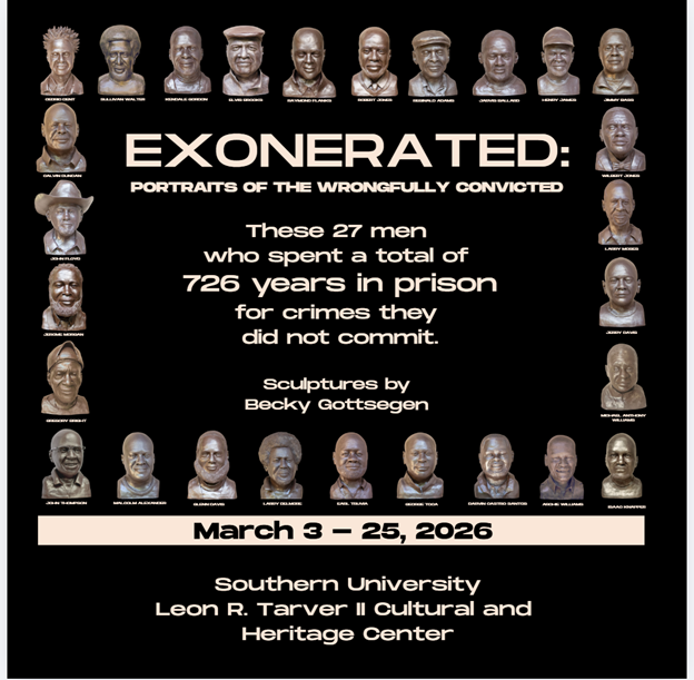 Gottsegen’s exhibit presents sculpted busts and visual narratives honoring individuals who were wrongfully convicted and later exonerated after serving a combined 726 years in prison. The installation is designed to encourage reflection and public conversation about accountability, reform and the human impact of wrongful incarceration.