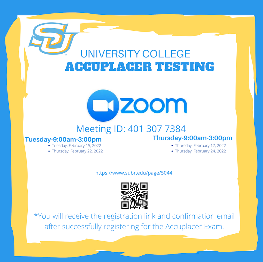 Accuplacer Testing is a placement exam used for students with no ACT/SAT scores for placement into SUBR Math and English courses. Students are allowed to take the Accuplacer exam one time to gain desired scores for placement (250). SUBR will offer Accuplacer testing in person only. To register for the Accuplacer exam please click on the Registration Form below. The cost of registration is $25. BE sure to select "sign out" in the top right hand corner to process your payment in full!