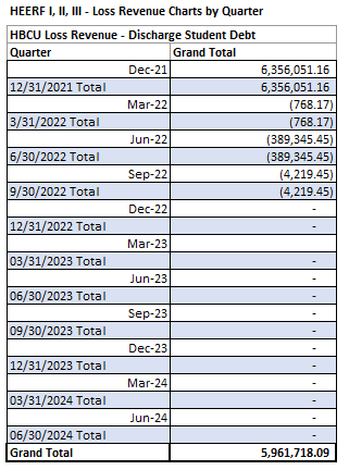 The links for the HEERF I, II and III quarterly reports for the Student Portion (at June 30, 2022) Institutional Portion and HBCU award are shown below.