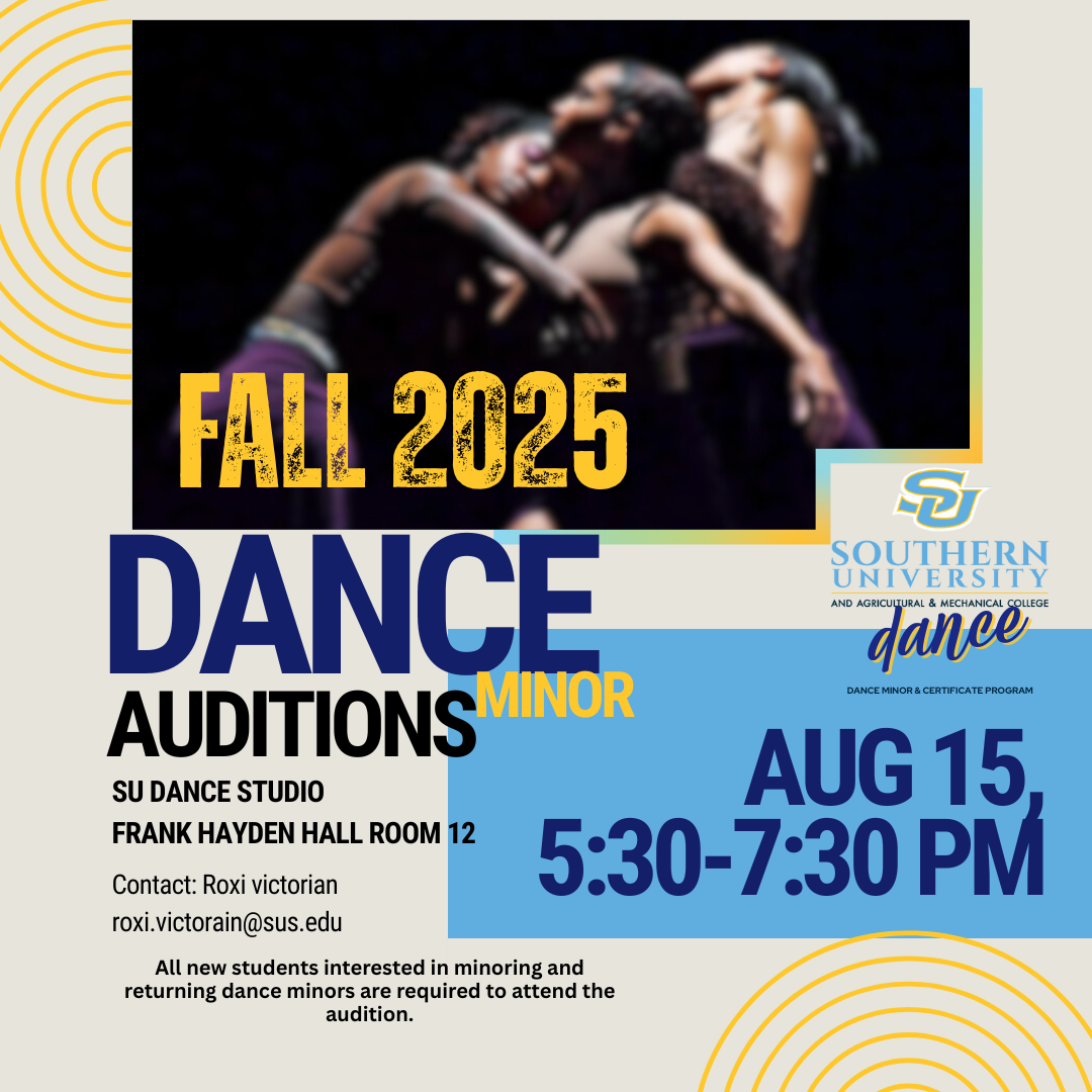 Auditions for admission into the Certificate of Dance and Minor in Dance Program for the 2024-2025 academic year will be held on the campus of Southern University A&M College in Hayden Hall Dance Room 12. Please complete the form below if you are interested in auditioning or learning more about the program. We look forward to hearing from you!