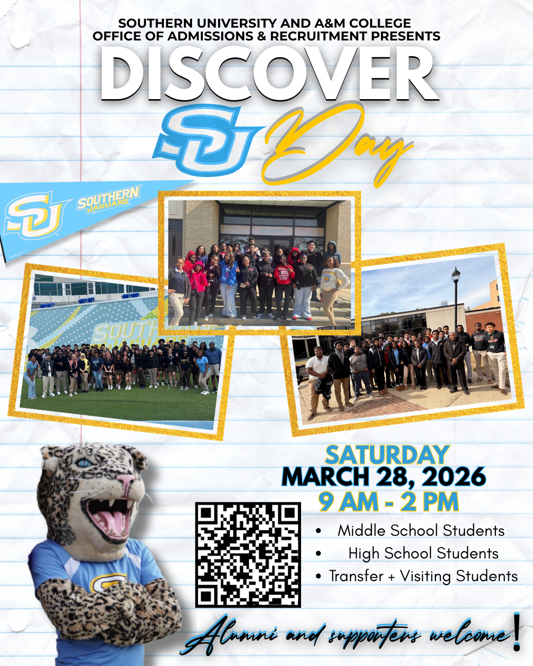 Southern University Academic Homecoming is kickoff with Discover Southern U Day. We will welcome future Jaguars with an interactive Jaguar Prowl campus tour that features exhibits and activities showcasing everything Southern University and A&M College has to offer.