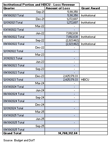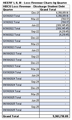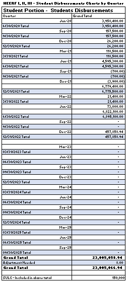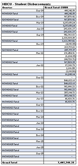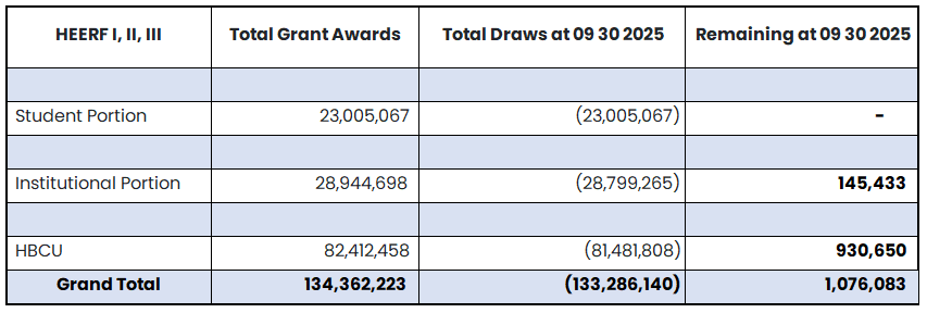 Student Portion - CFDA# 84.425E, Award Number P425E200926, Award Amount is $$23,005,067. Institutional Portion - CFDA# 84.425F, Award Number P425F201887, Award Amount $28,944,698. HBCU - Emergency Relief Fund CFDA# 84.425J, Award Number P425J200055, Award Amount 82,412,458. |