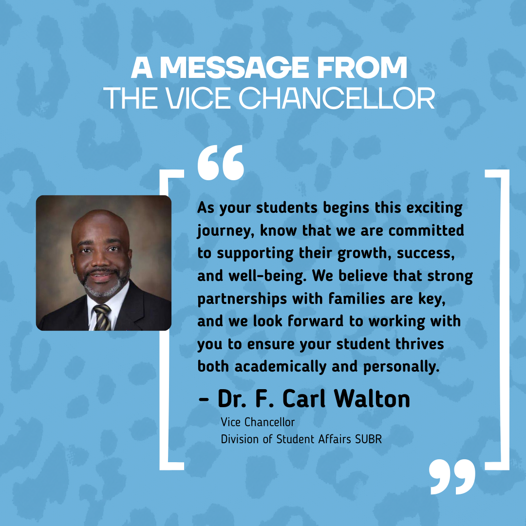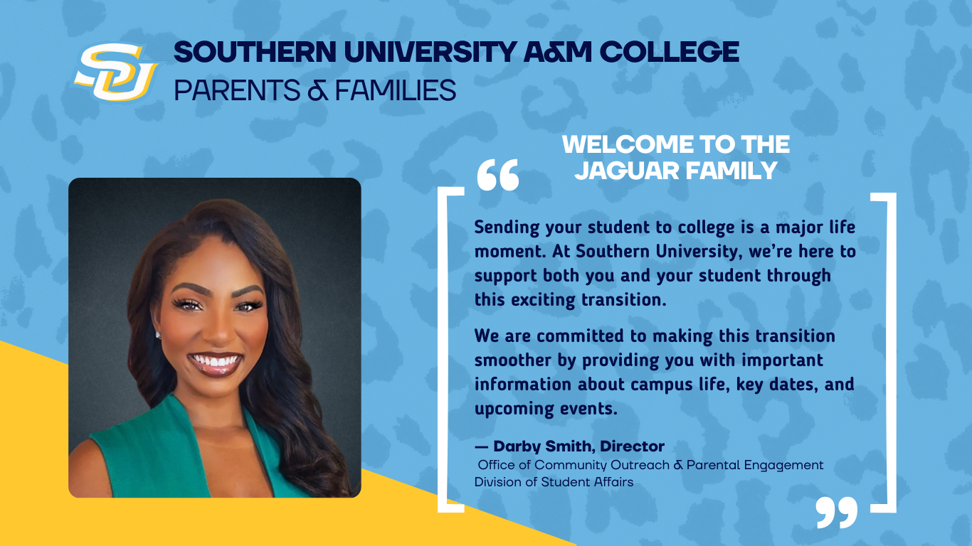 WelcomeWe would like to welcome you to the family! Sending your student to college is a major life event for all families. Southern University is here to assist you and your student in making this transition easier by providing the latest information about campus life, important dates, and events. We thank you for your continued support, and we welcome your ideas and feedback during your student’s SU experience. Please note: The content of this page is constantly being updated for accuracy. |