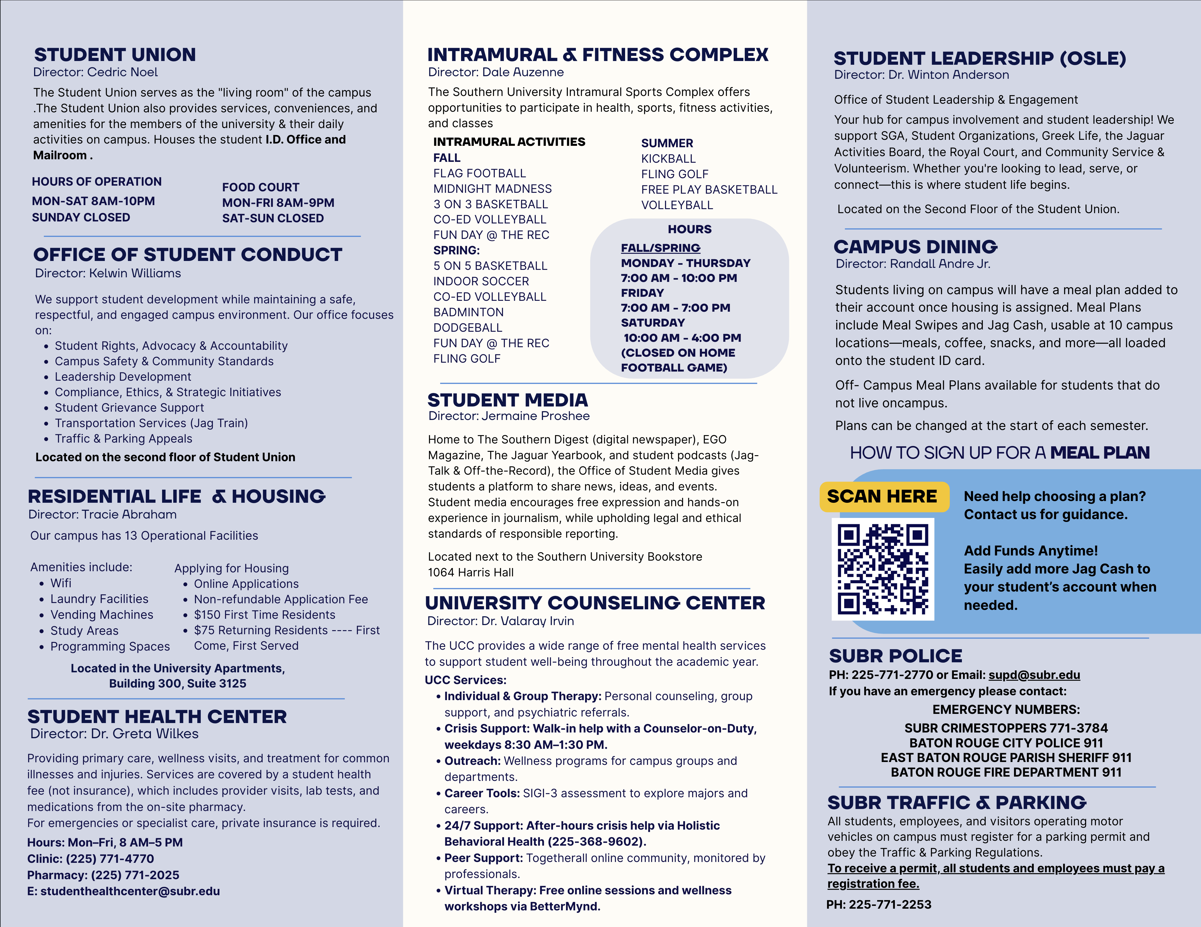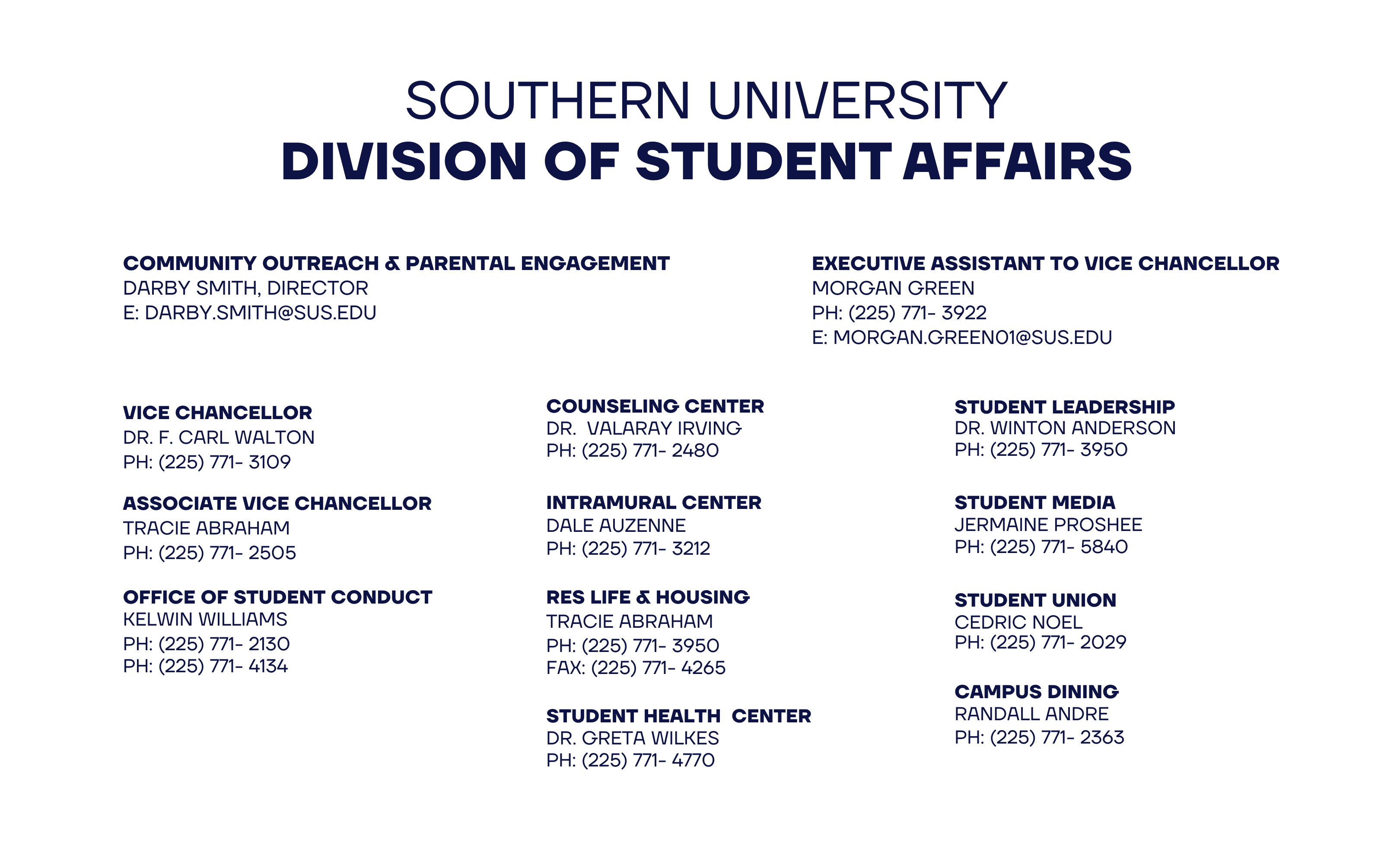 - Student Advocacy: assistance and guidance to help students resolve any barriers to productivity and ensure the quality of their experience at Southern University.